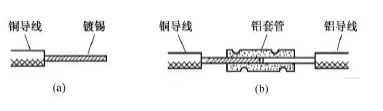 (2)銅導線與鋁導線之間的緊壓連接。當需要將銅導線與鋁導線進行連接時,必須采取防止電化腐蝕的措施。因為銅和鋁的標準電極電位不一樣,如果將銅導線與鋁導線直接絞接或壓接,在其接觸面將發生電化腐蝕,引起接觸電阻增大而過熱,造成線路故障。常用的防止電化腐蝕的連接方法有兩種。